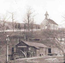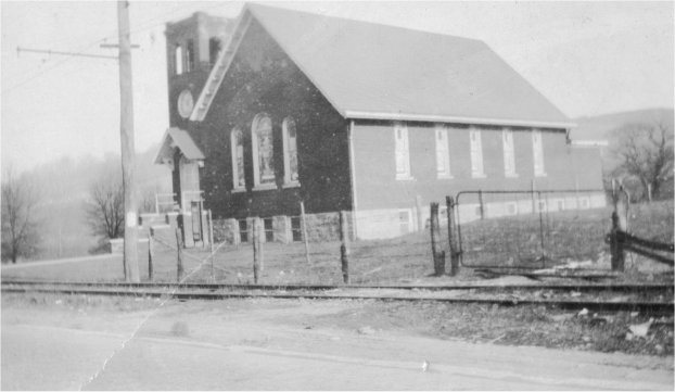 | The background drawings show our old church. As you can see, it sat on a hill above what was once the Barrackville Train Station. | |